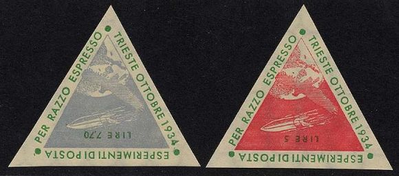 Zucker fece preparare speciali fascette triangolari per commemorare l’evento. Per il trasporto via “razzo espresso ” veniva richiesta una piccola sovrattassa di 5 e 7,70 lire segnalata nell’apposita fascetta, quando la normale affrancatura era di 10 centesimi (25 per l’estero)!