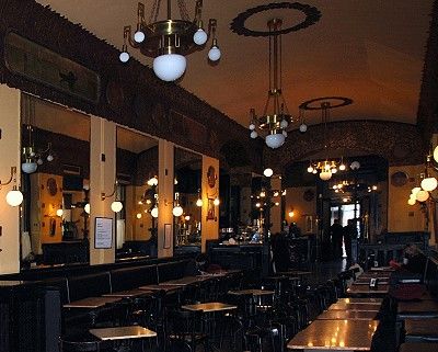 Se non sei di Trieste e ci passi davanti non ci fai neppure caso, tanto è anonimo. Potrebbe sembrare un magazzino o una vecchia bottega artigiana come ce ne sono tante negli angoli dispersi delle città. Vecchie porte in legno a vetri con delle mezze tendine, tendoni una volta rossi, ma sbiaditi dalla luce. Anche l’insegna non ti aiuta, posta com’è sull’angolo del palazzo, di quelle insegne al neon tanto anni sessanta, visibilissime di notte, ma pressoché indistinte di giorno. Ma appena ne varchi la soglia è come se accendessi un lume a petrolio e venissi scaraventato indietro nel tempo. Atmosfera soffusa, tavolini di marmo e ghisa, legni scuri ovunque, specchi, stucchi, seggiole di quelle di una volta dalla seduta segnata, drappi e ottoni. Viene quasi il gesto istintivo di tirar fuori l’orologio dal taschino per controllare l’ora.